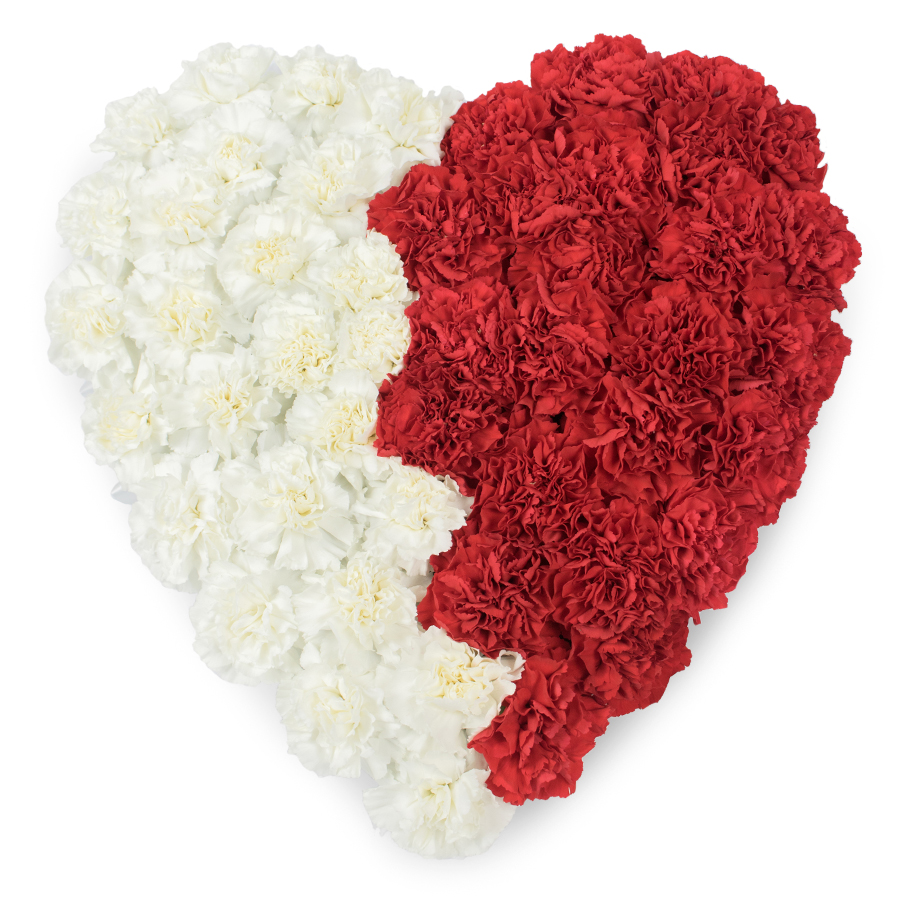 Experience the beauty and uniqueness of our heart-shaped bouquet, expertly crafted with vibrant white and red carnations. Each flower is hand-selected to ensure the highest quality and freshness, making this arrangement a perfect expression of sympathy.